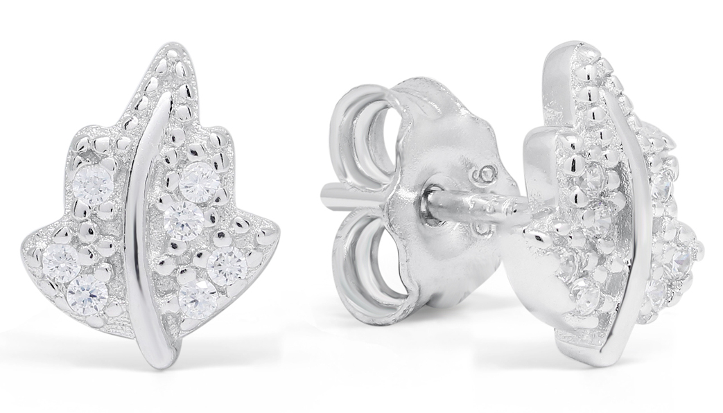 The plant motifs are part of the authentic 20's style. These sterling silver leaf synthetic zirconia E-0886Z earrings have a beautiful oak leaf design and are adorned with brilliant cut synthetic zirconia. The back features a pin clasp. The earrings measure 6.5 mm wide and 8.3 mm high and are supplied in the original manufacturer's packaging.