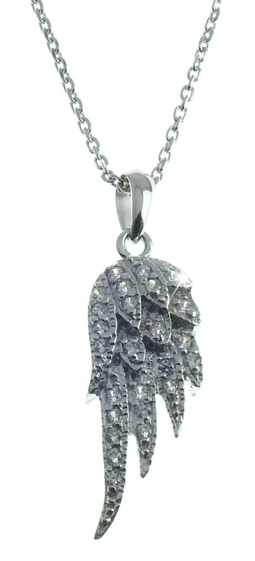 Beautiful Angel's Wing pendant with slender anchor chain. Elegant and timeless, this pendant is decorated with sparkling synthetic zirconia. The angel's wing symbolises protection and security, so as a gift this pendant has more meaning than just a beautiful accessory. The pendant measures 29mm high and 11mm wide and is strung with a 1mm silver anchor chain. The length of the chain is 45cm. Both the pendant and the chain are made of rhodium-plated 925 sterling silver.