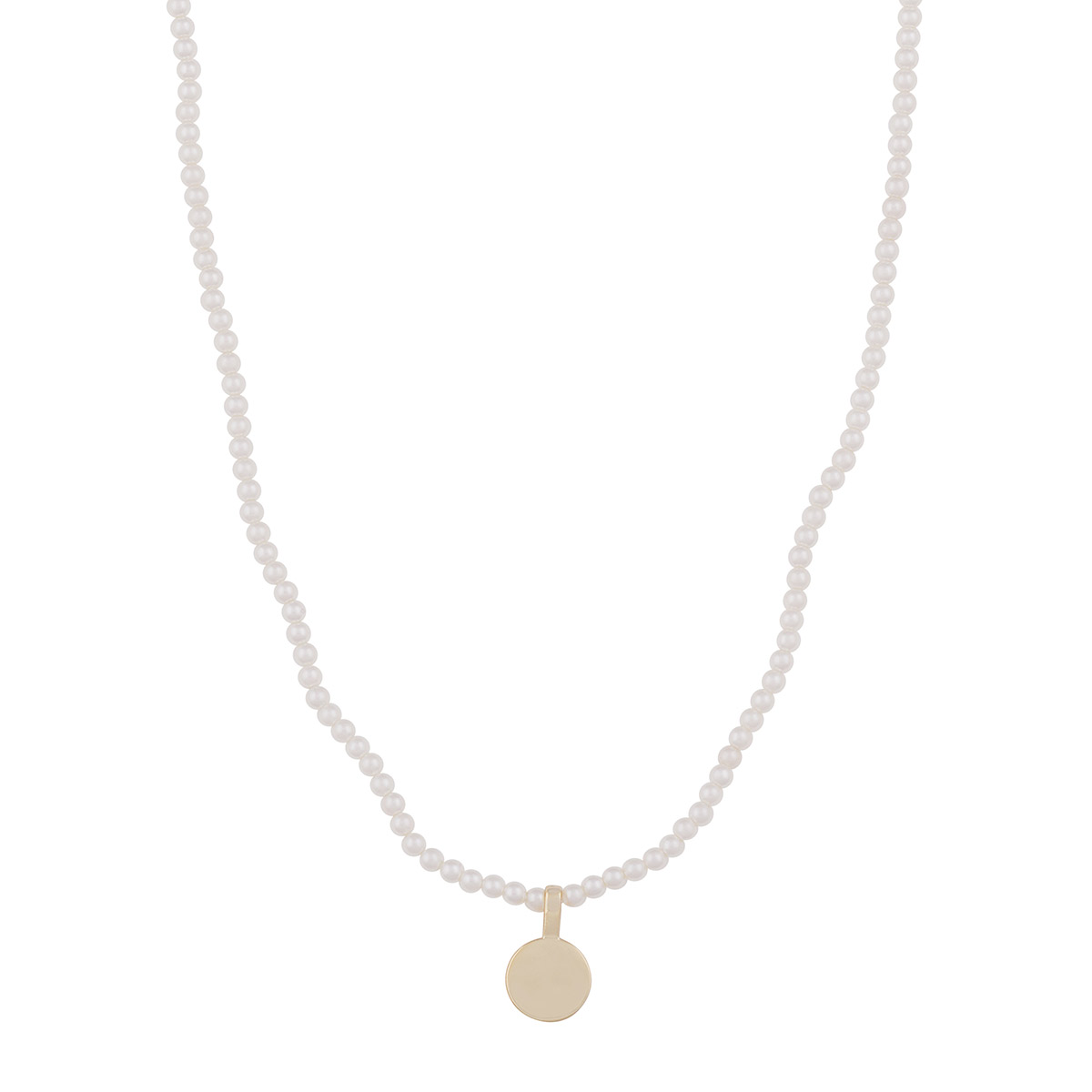 The modern, minimalist Snö of Sweden Essential pearl necklace harmoniously combines classic white pearls and gold tones. Made of gold-plated brass, the coin pendant sits lightly in the middle of a necklace made of 2 mm glass beads. Pendant 8 mm.