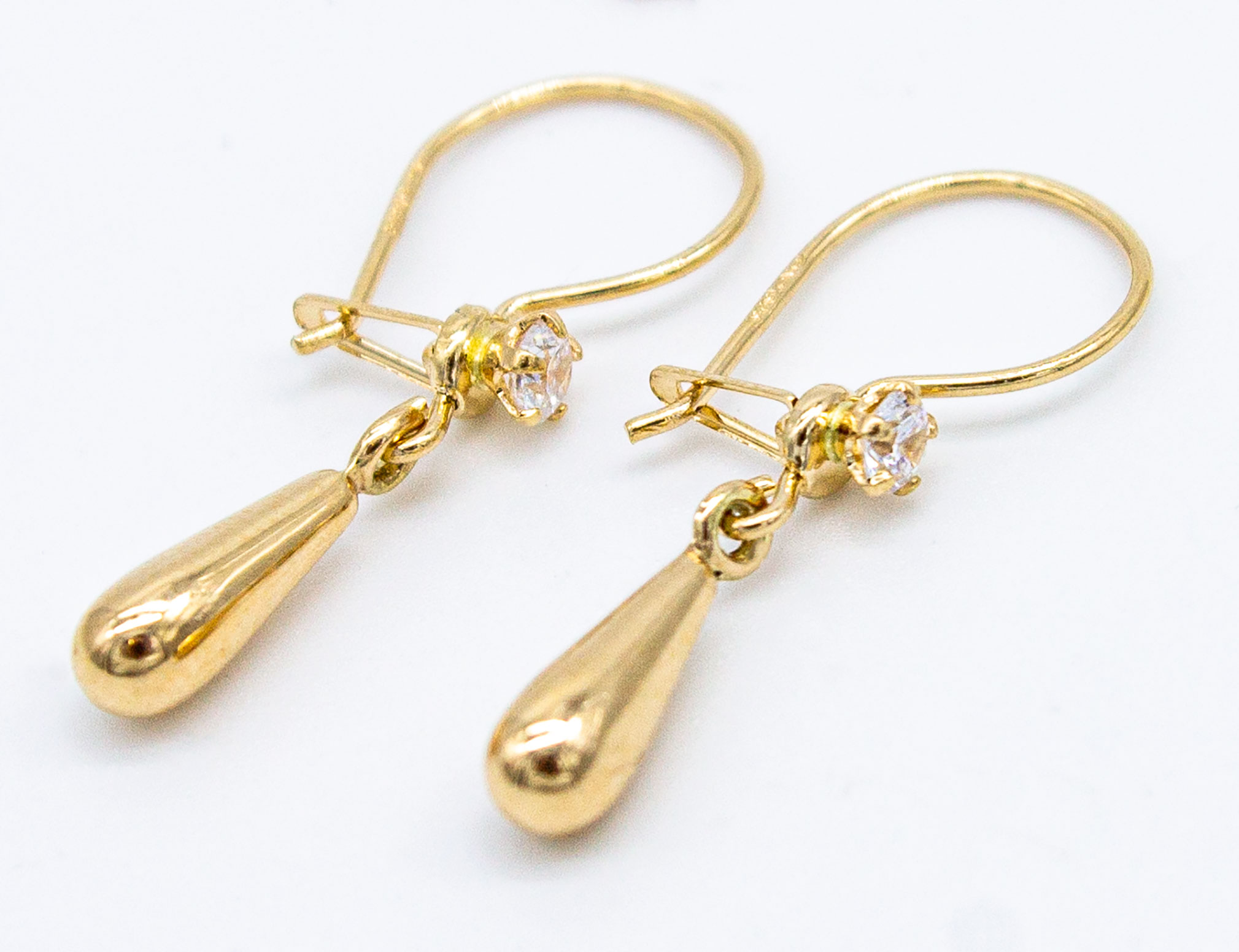 PK2-23 torpedo earrings are made of 14 karat gold. The design is a smooth teardrop. The earrings have a hook fastening with glittering zirconia attached. The length of the earrings is 11 mm.