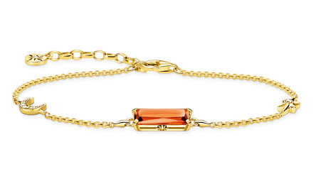 The Thomas Sabo orange stone with star and moon gold A1958-971-8-L19V bracelet features a luxurious orange glass crystal set in an 18-karat gold-plated frame. The chain length is adjustable to 16-19 cm. The Thomas Sabo jewellery comes in the original manufacturer's box.