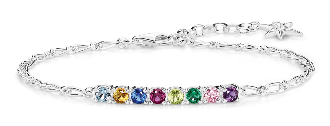 The Thomas Sabo SCA150333 bracelet is made of sterling silver. It is decorated with different colored cubic zirconia, synthetic corundum and spinel and glass-ceramic stones. The length of the chain is adjustable between 16 and 19 cm. Locking with parrot clasp. Thomas Sabo jewellery is delivered in the manufacturer's original box.