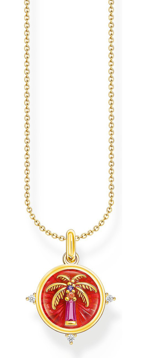 Thomas Sabo Charm Club Charming Festival necklace KE2204-471-7-L45v features beautiful and colourful enamelling, and a palm tree with a beachy wibe. The chain and the jewellery are 18-karat gold-plated sterling silver, and the chain length is adjustable between 40-45 cm. The Thomas Sabo jewellery comes in the original manufacturer's box.