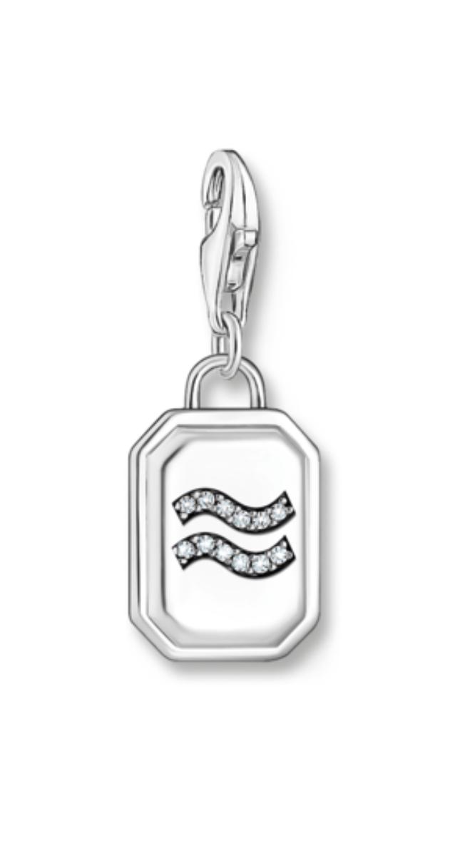 Thomas Sabo Charm Club Charm Aquarius charm 2143-643-21 is adorned with the Aquarius star sign sign. The silver horoscope pendant measures 26 mm and is made of sterling silver.