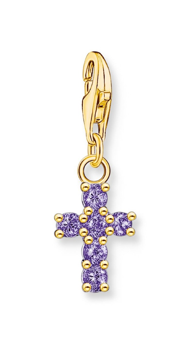 Thomas Sabo Charm Club Charm cross purple stones yellow-gold plated charm 2036-414-13 is made of 18-karat gold-plated sterling silver. The cross pendant is decorated with several brilliant-cut, prong-set stones. The pendant measures 25 x 9 mm.