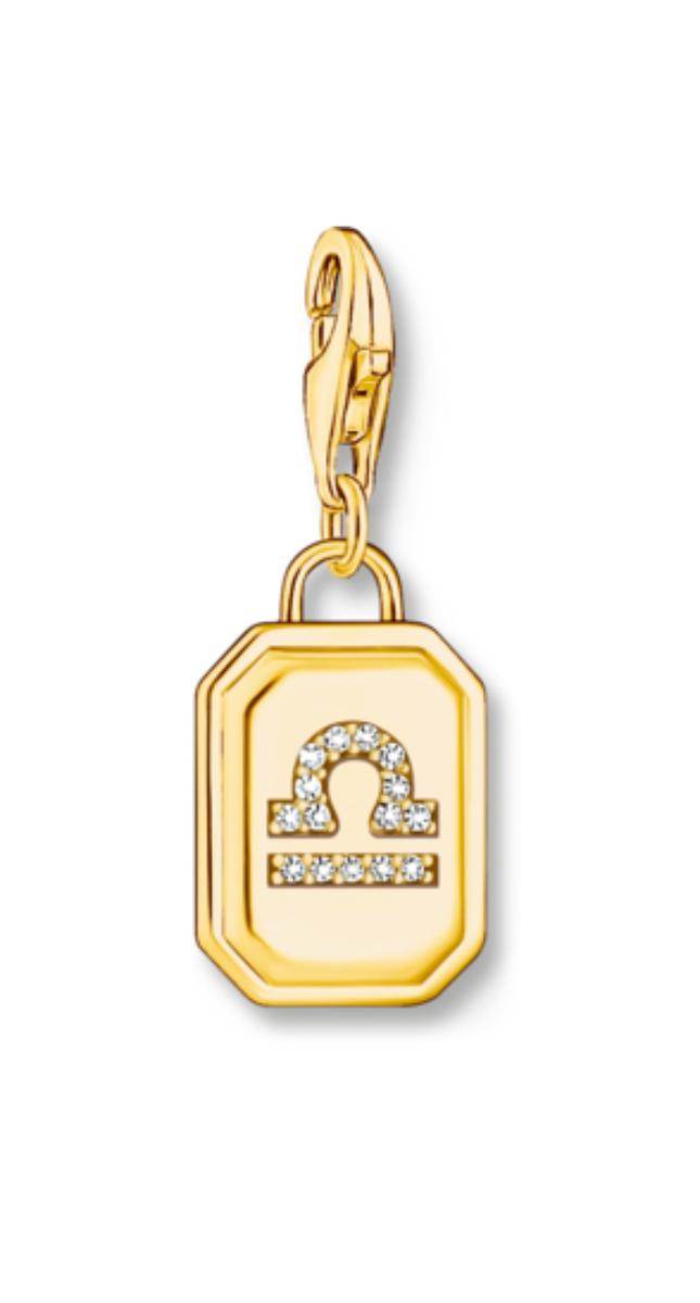 Thomas Sabo Charm Club Charm 2153-414-39 is decorated with the star sign of the Libra. The horoscope pendant measures 26 mm and is made of 18-karat gold-plated sterling silver.