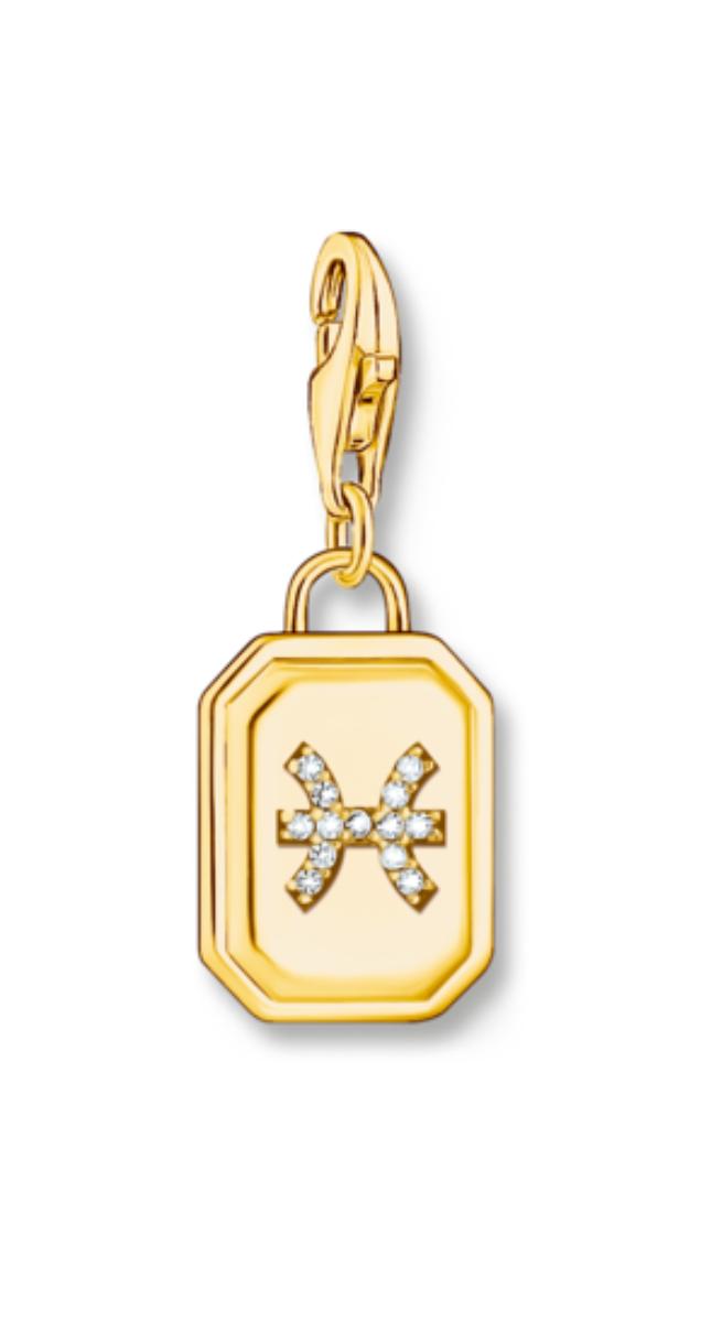 Thomas Sabo Charm Club Charm Pisces charm 2154-414-39 is adorned with a Pisces star sign. The horoscope pendant measures 26 mm and is made of 18-karat gold-plated sterling silver.
