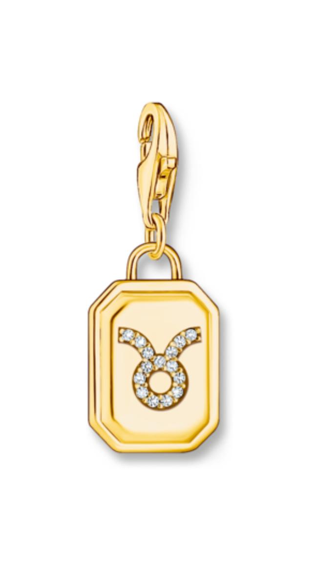 Thomas Sabo Charm Club Charm bull charm 2163-414-39 is decorated with the bull star sign. The horoscope pendant measures 26 mm and is made of 18-karat gold-plated sterling silver.