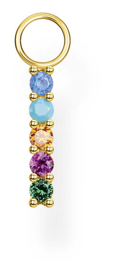 The Thomas Sabo earring pendant EP007-488-7 is a small 18 karat gold plated pendant decorated with synthetic zirconia in different colours. The pendant is intended to be slipped onto the earrings of the Thomas Sabo earring set or in front of a pin earring. The pendant is made of high quality sterling silver. Thomas Sabo jewellery is supplied in the original manufacturer's box.