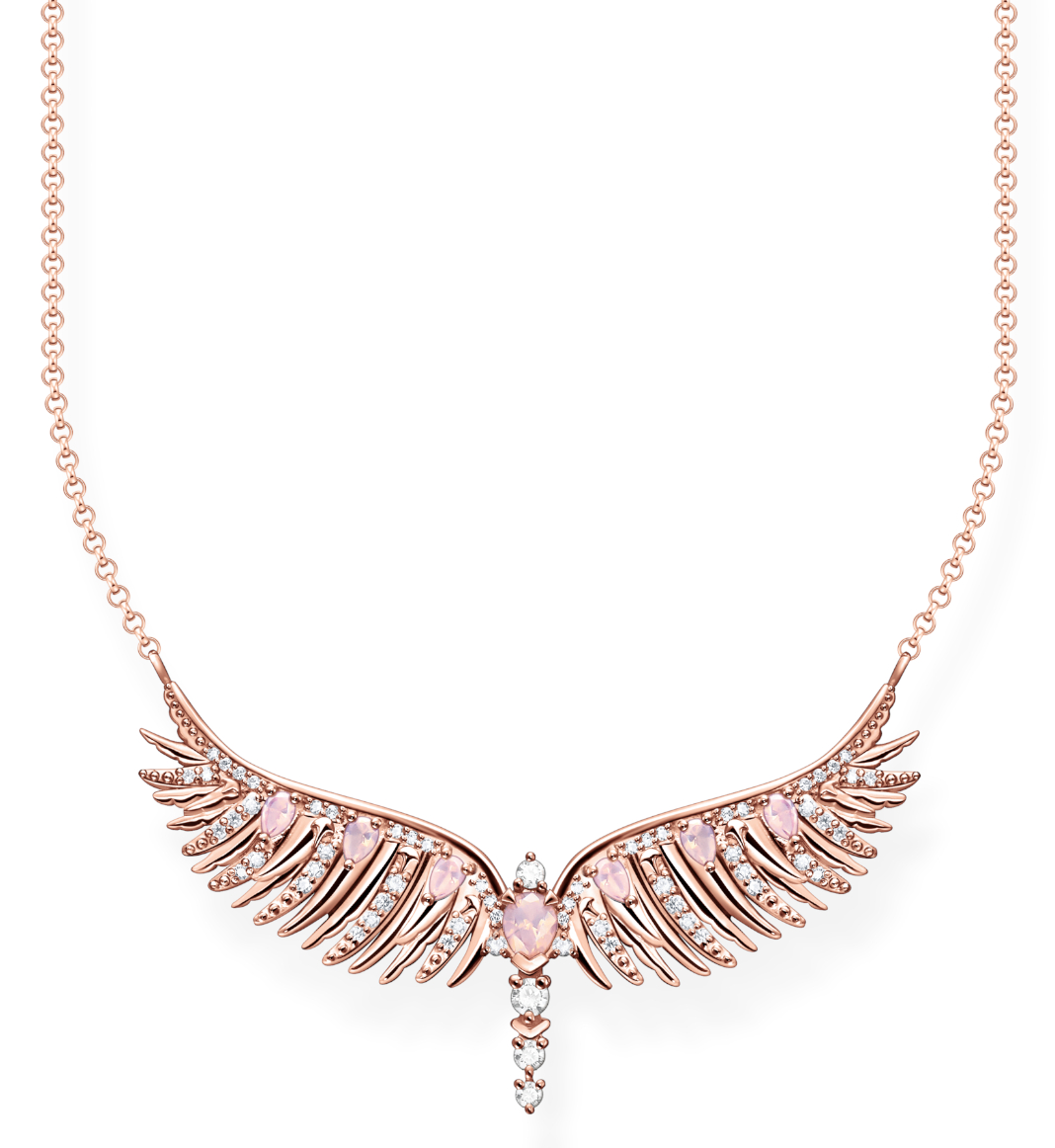 The Thomas Sabo Rising Phoenix jewellery range is themed around rebirth and renewal. It reminds us of the endless possibilities of life. The Thomas Sabo Rising Phoenix necklace KE2167-323-9-L45V is made of 18-karat rose-gold-plated sterling silver and the pendant is adorned with synthetic zirconia and synthetic glass crystals. The chain is adjustable from 40-45 cm in length. Pendant size 46 x 15 mm. Thomas Sabo jewellery is delivered in the original manufacturer's box.