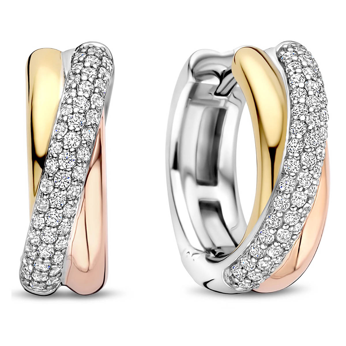 TI SENTO 78012ZT crossover earrings feature a dynamic and visually striking design. The earrings feature silver, yellow gold, and rose gold colored loops and a loop filled with pave-set zirconia. The earrings are made of premium 925 sterling silver and plated with bright platinum for a durable and radiant finish. Carefully crafted for sensitive skin, the nickel-free and hypoallergenic earrings guarantee lasting comfort and quality. The earrings are 14 mm long and 5 mm wide.