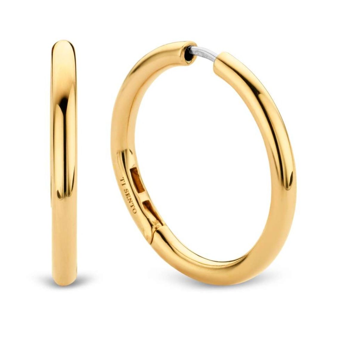 TI SENTO gold-plated silver hoops 30 mm 7782SY are a versatile accessory for a variety of styles. The surface of the earrings is decorated with yellow gold plating and the diameter is 30 mm. A hinge mechanism makes it easy to put on. TI SENTO jewellery has a 2 year guarantee against material and manufacturing defects, and is delivered to your home in the manufacturer's beautiful jewellery box.