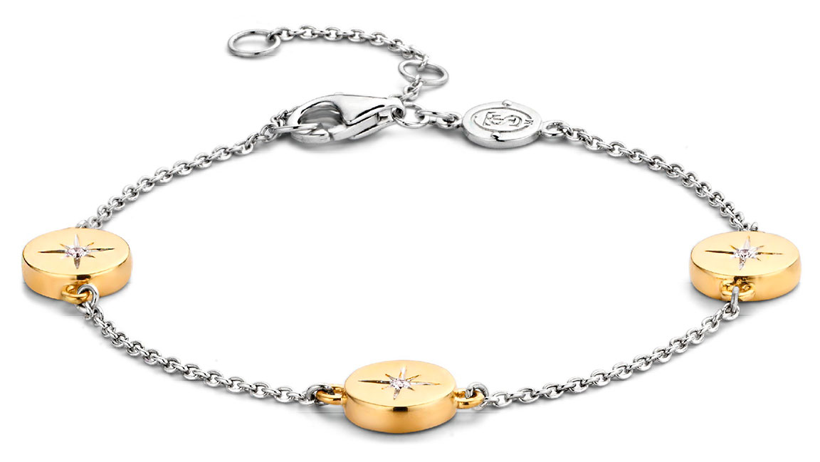 The TI SENTO 2941ZY bracelet is made of rhodium-plated sterling silver. The 2941ZY bracelet features three 18 karat gold-plated discs with engraved stars and white synthetic zirconia in the centre. The bracelet is adjustable in length from 16 to 20 cm and the gold plates are 8 mm thick. TI SENTO jewellery has a 2 year guarantee against material and manufacturing defects, and is delivered to your home in the manufacturer's beautiful jewellery box.