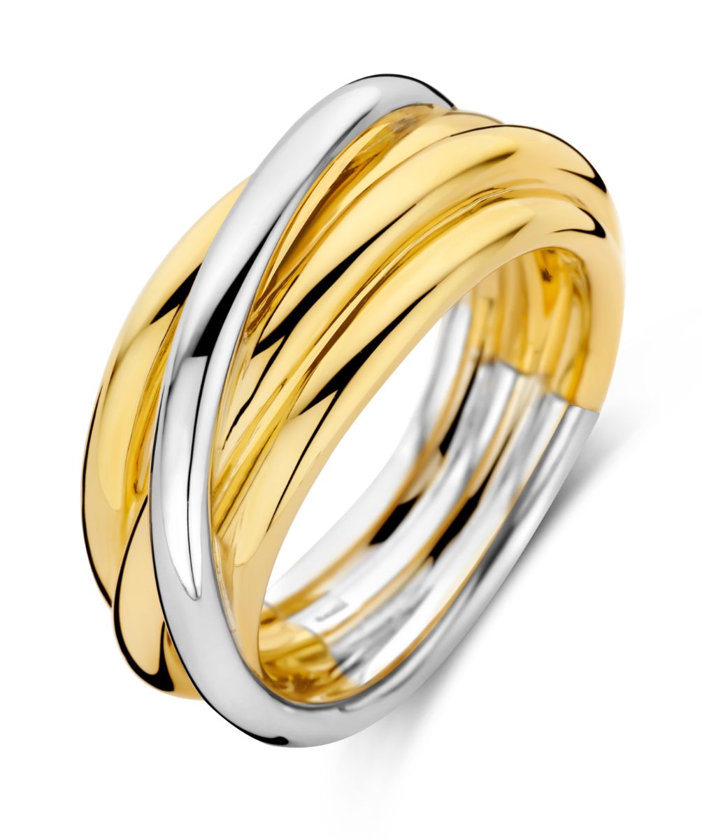 TI SENTO two-tone crossover silver ring 12056SY is an impressive and wide ring with a yellow gold surface. The statement ring measures 9 mm in width and is available in several sizes. The finish is platinum plating, which keeps the silver shining for a long time. TI SENTO jewellery is made of sterling silver and is delivered to your home in the manufacturer's beautiful jewellery box. TI SENTO jewellery has a 2 year guarantee against material and manufacturing defects.