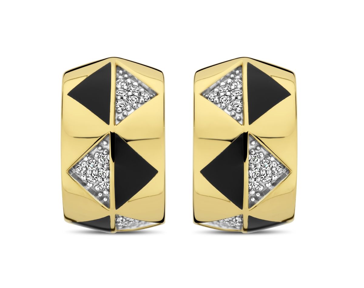 TI SENTO two-tone wide huggie earrings 7987BL are sterling silver plated with genuine yellow gold, embellished with clear zirconia and black enamel. TI SENTO two-tone wide huggie earrings 7987BL are platinum-plated, which prevents scratching and keeps the surface shiny for a long time. TI SENTO jewellery comes with a 2-year guarantee covering manufacturing and material defects. The jewellery is delivered in the manufacturer's original box.