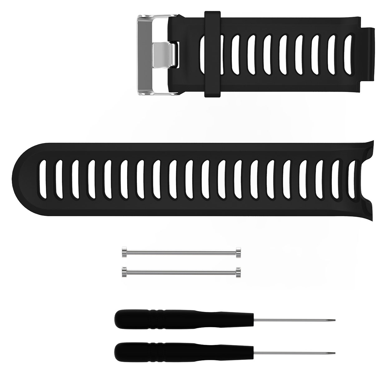 Tiera Garmin Forerunner 910XT wrist strap black fits Garmin Forerunner 910XT smart watches. The watch strap is made of silicone and the buckle is stainless steel. The watch strap comes with mounting pins and 2 screwdrivers. The watch strap comes with a 1-year warranty. The warranty covers defects in materials and workmanship. This watch strap is not manufactured by Garmin, it is an accessory watch strap.