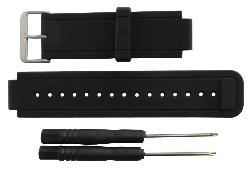 Tiera Garmin Vivoactive wristband black fits Garmin Vivoactive smart watches. The wristband is made of silicone and the buckle is stainless steel. The watch strap comes with 2 torx screwdrivers. The watch strap comes with a 1 year warranty. The warranty covers defects in materials and workmanship. This product is not manufactured by Garmin, it is an accessory wristband.