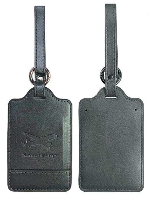 Tiera Black is a monochrome luggage tag made of glossy faux leather, featuring an airplane and the text "Have a Nice Trip". The travel wallet measures 7 cm in width and 11,5 cm in length. The black tag is easy to attach to your suitcase, so your contact details are always with you. On the back of the tag is a contact card where you can fill in your name, address, phone number and email address.