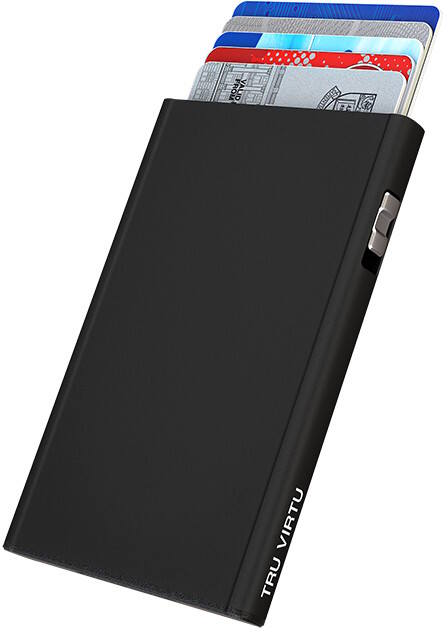 Tru Virtu Click & Slide Card Case Black Magic is a black RFID-blocking Wallet card case that holds 5 cards. Tru Virtu Click & Slide wallets use the innovative and patented "Click & Slide" technology. With the push of a thumb, your cards pop out of the aluminium case in a staggered manner and you can conveniently pick the right card. The aluminium case also protects your cards from remote reading. The case is 9mm thick and 99mm high and holds up to 5 cards.