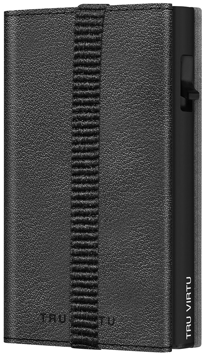 Tru Virtu Click & Slide Strap Edge Wallet Nappa Black RFID-blocking Wallet is made of leather. Tru Virtu Click & Slide RFID wallets use the innovative and patented "Click & Slide" technology. With the push of a thumb, your cards pop out of the aluminium case in a staggered manner and you can conveniently pick the right card. The aluminium case also protects your cards from remote reading. The wallet is wrapped in Italian leather, which opens into a bill and card pocket at the touch of a button, so you can carry your notes and receipts with you. The wallet is 99 x 67 x 19 in size. The aluminium case holds 5 cards and the opening leather pocket holds 7 more.