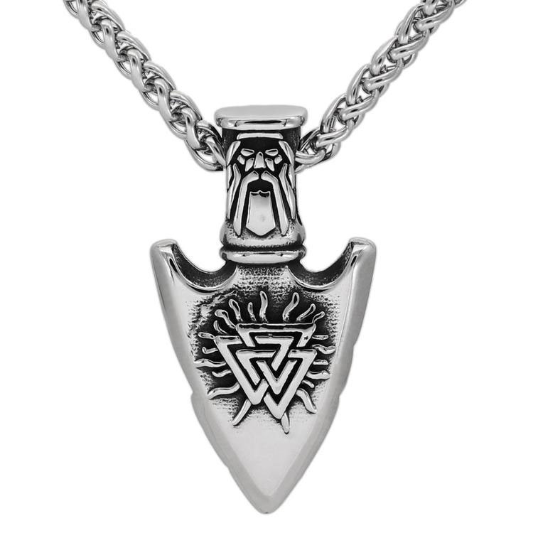 The Varia Design Gungner necklace is made of silver-colored stainless steel. The chain is 4 mm thick and 60 cm long. The Gungnir spearhead of Odin's magical spear hangs from the necklace, which measures 45 x 24 mm and weighs 42 grams. Varia Design jewellery is delivered in the original manufacturer's packaging.