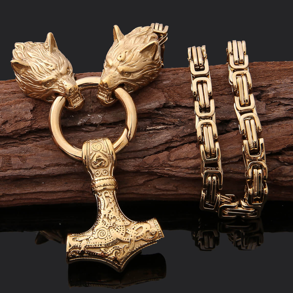The Varia Design Pure Golden Wolves necklace features Odin's wolves Greke and Freke and Thor's hammer. The pendant measures 45 x 32 mm and the chain length is 70 cm. Varia Design jewellery is delivered in the original manufacturer's box.
