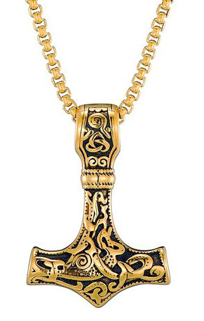 Varia Design Thor necklace gold - the necklace is made of gold-colored stainless steel. A 43 x 30 mm Thor's hammer hangs from the necklace. The necklace is 55 cm long and 3 mm thick and weighs approximately 50 grams. The Varia Design jewellery is delivered in the original manufacturer's packaging.